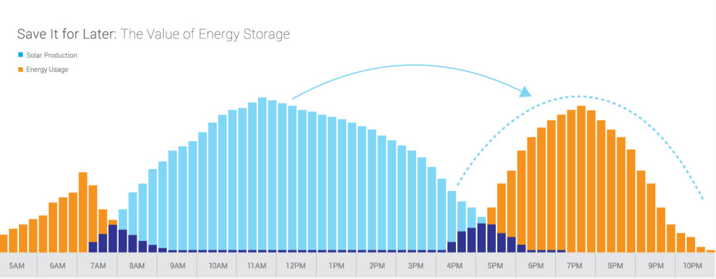 The need for solar storage evolves from a simple fact – solar power can only be generated using daylight – when the sun is out. Further, the typical household consumes more power in the evening – when there is no sunlight and hence no opportunity to generate solar power – as illustrated by the enPhase diagram: