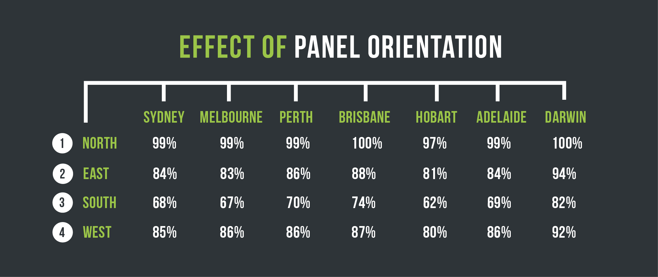 South Orientation: To date, installing south facing solar panels has been a shunned option with the belief that the systems won't perform at all. This is actually a myth. In Brisbane, south facing panels will produce around 26% less energy than north facing panels. They produce power early in the morning and late in the evening, matching peak air conditioning demands as well as cooking and other energy-intensive activities that tend to occur during these hours.